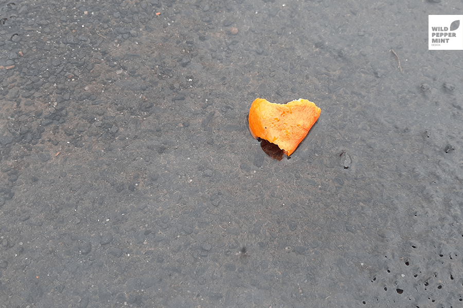 Gefunden beim draußen Gehen. Ein Herz. Aus Mandarinenschale. Achtlos weggeworfen (nicht schön!). Dennoch: Es hat mein Herz erfreut.