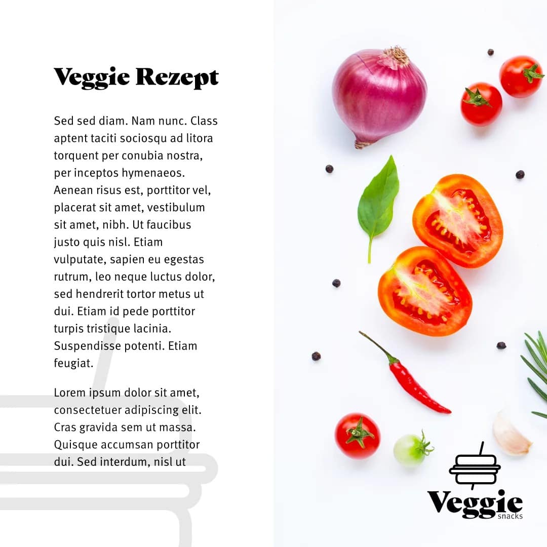 Ach noch eins: Natürlich könnte der Schriftzug „Veggie“ noch individueller werden. Zum Beispiel, in dem ich die Buchstaben mit einem coolen Twist versehe. Oder, wenn es verschiedene Snackvarianten gibt, kann das Symbol einfach mit anderen Farben angepasst werden. Oder ein anderes Symbol in gleicher, einfacher Gestaltung. Du siehst, es geht noch mehr.