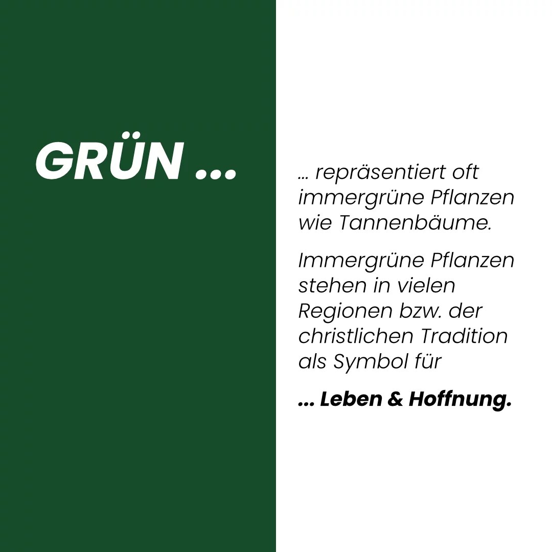 Rot steht traditionell in vielen Kulturen für Weihnachten. In der christlichen Tradition steht Rot für das Blut Christi. Grün wird oft mit immergrünen Pflanzen wie Tannenbäumen in Verbindung gebracht und steht für das Leben und die Hoffnung. Rot und Grün als klassische Weihnachtsfarben werden auch mit der Natur und Winterlandschaften verbunden. Logisch. 🙃 Zumindest in den nördlicheren Breitengraden.